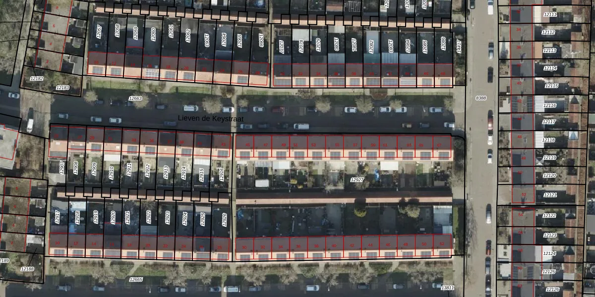 Het perceel waarop Lieven de Keystraat 51 staat heeft een oppervlakte van 3320 m². Dit is een zeer groot perceel. De perceeloppervlakte wordt geregistreerd door het Kadaster. Gedetailleerde informatie over de maten van dit perceel kunt u vinden in het rapport Kadastrale kaart met maatvoering van Lieven de Keystraat 51.