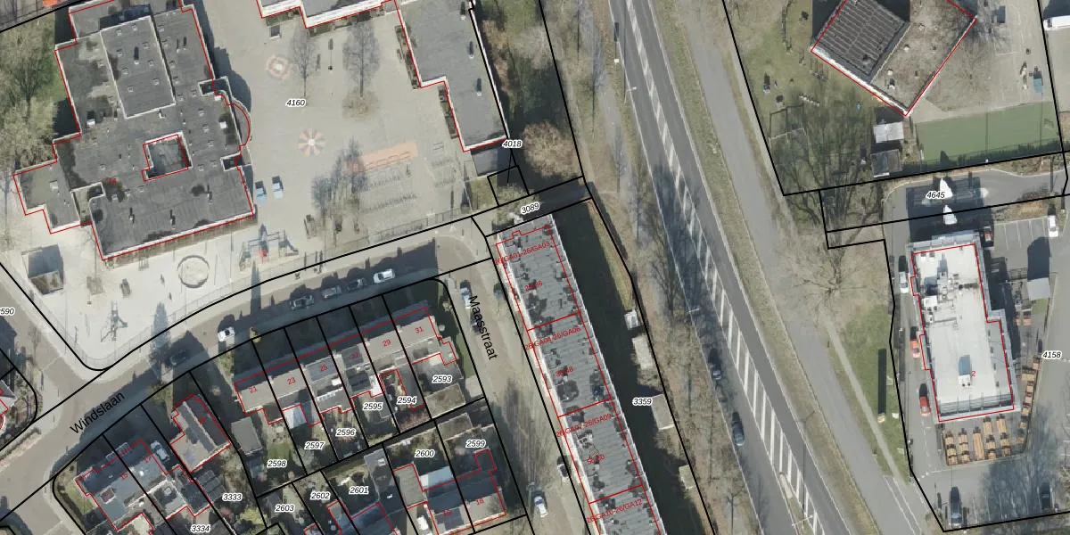Het perceel waarop Maasstraat 28 staat heeft een oppervlakte van 2435 m². Dit is een zeer groot perceel. De perceeloppervlakte wordt geregistreerd door het Kadaster. Gedetailleerde informatie over de maten van dit perceel kunt u vinden in het rapport Kadastrale kaart met maatvoering van Maasstraat 28.