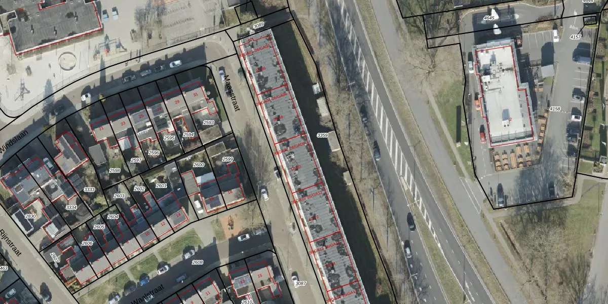 Het perceel waarop Maasstraat 54 staat heeft een oppervlakte van 2435 m². Dit is een zeer groot perceel. De perceeloppervlakte wordt geregistreerd door het Kadaster. Gedetailleerde informatie over de maten van dit perceel kunt u vinden in het rapport Kadastrale kaart met maatvoering van Maasstraat 54.