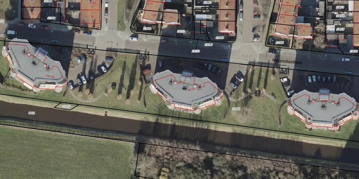 Het perceel waarop Magnoliastraat 98 staat heeft een oppervlakte van 1,1 ha. Dit is een zeer groot perceel. De perceeloppervlakte wordt geregistreerd door het Kadaster. Gedetailleerde informatie over de maten van dit perceel kunt u vinden in het rapport Kadastrale kaart met maatvoering van Magnoliastraat 98.