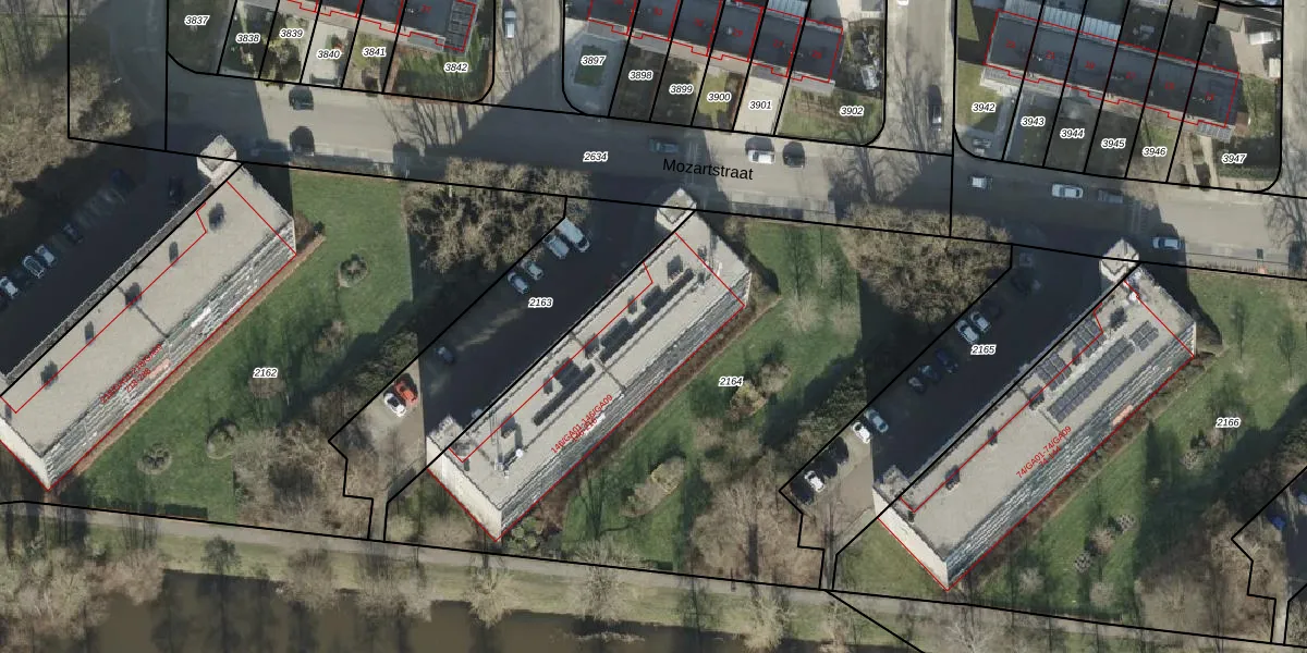 Het perceel waarop Mozartstraat 172 staat heeft een oppervlakte van 3055 m². Dit is een zeer groot perceel. De perceeloppervlakte wordt geregistreerd door het Kadaster. Gedetailleerde informatie over de maten van dit perceel kunt u vinden in het rapport Kadastrale kaart met maatvoering van Mozartstraat 172.