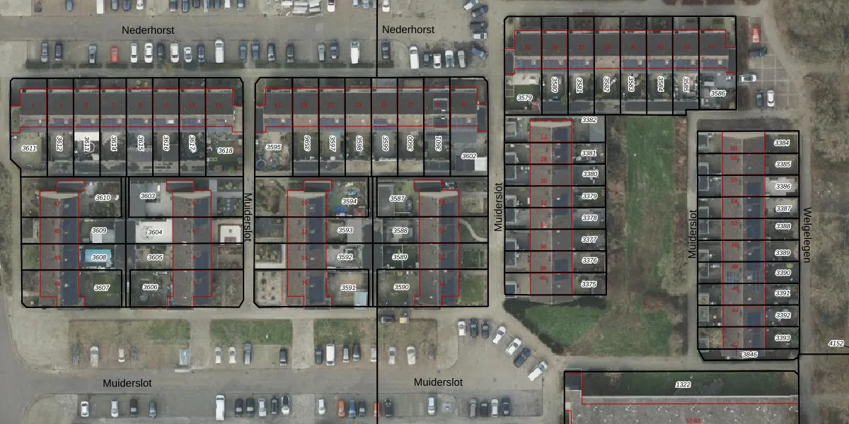 Het perceel waarop Muiderslot 24 staat heeft een oppervlakte van 250 m². Dit is een middelgroot perceel. De perceeloppervlakte wordt geregistreerd door het Kadaster. Gedetailleerde informatie over de maten van dit perceel kunt u vinden in het rapport Kadastrale kaart met maatvoering van Muiderslot 24.