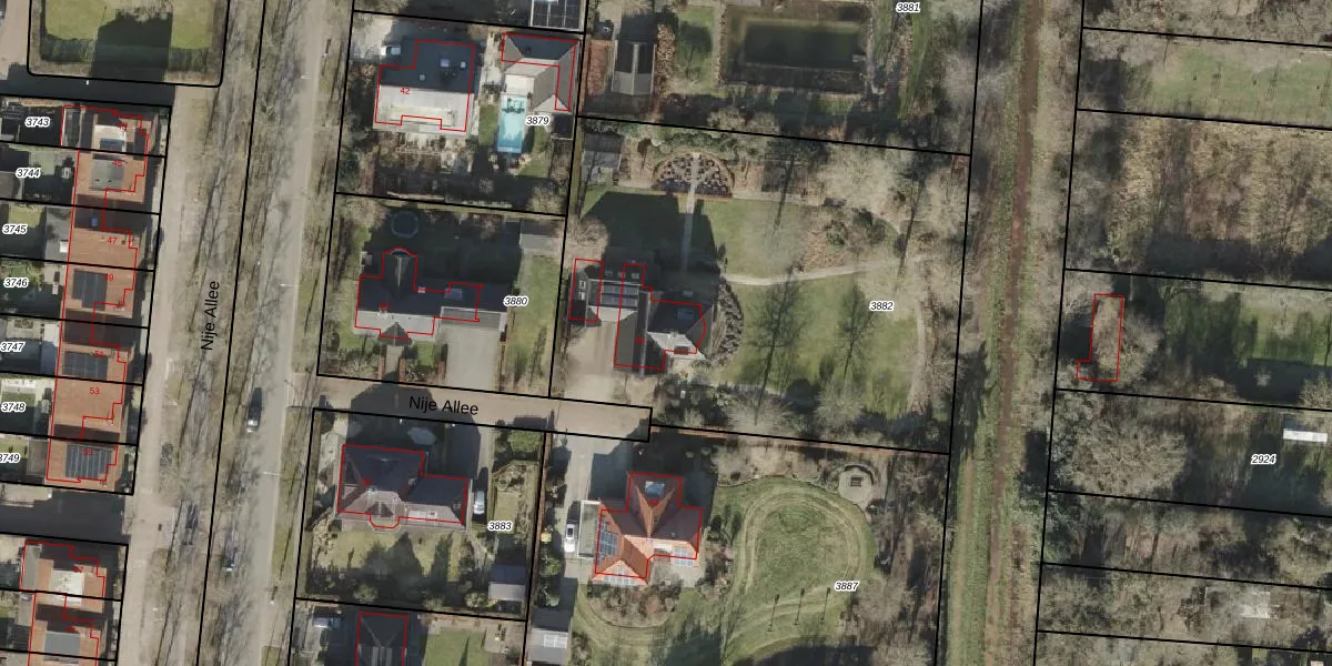 Het perceel waarop Nije Allee 46 staat heeft een oppervlakte van 2666 m². Dit is een zeer groot perceel. De perceeloppervlakte wordt geregistreerd door het Kadaster. Gedetailleerde informatie over de maten van dit perceel kunt u vinden in het rapport Kadastrale kaart met maatvoering van Nije Allee 46.