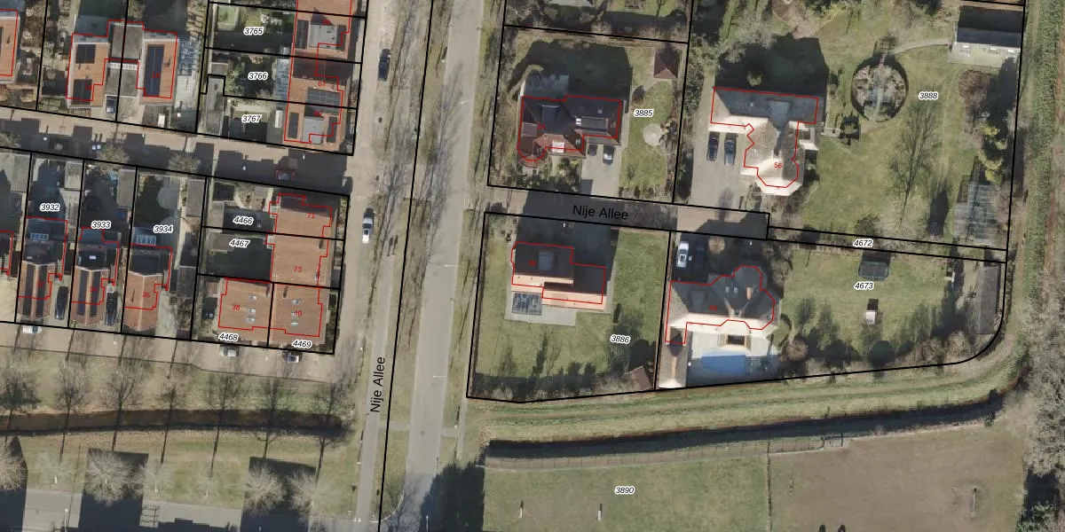 Het perceel waarop Nije Allee 60 staat heeft een oppervlakte van 1164 m². Dit is een zeer groot perceel. De perceeloppervlakte wordt geregistreerd door het Kadaster. Gedetailleerde informatie over de maten van dit perceel kunt u vinden in het rapport Kadastrale kaart met maatvoering van Nije Allee 60.