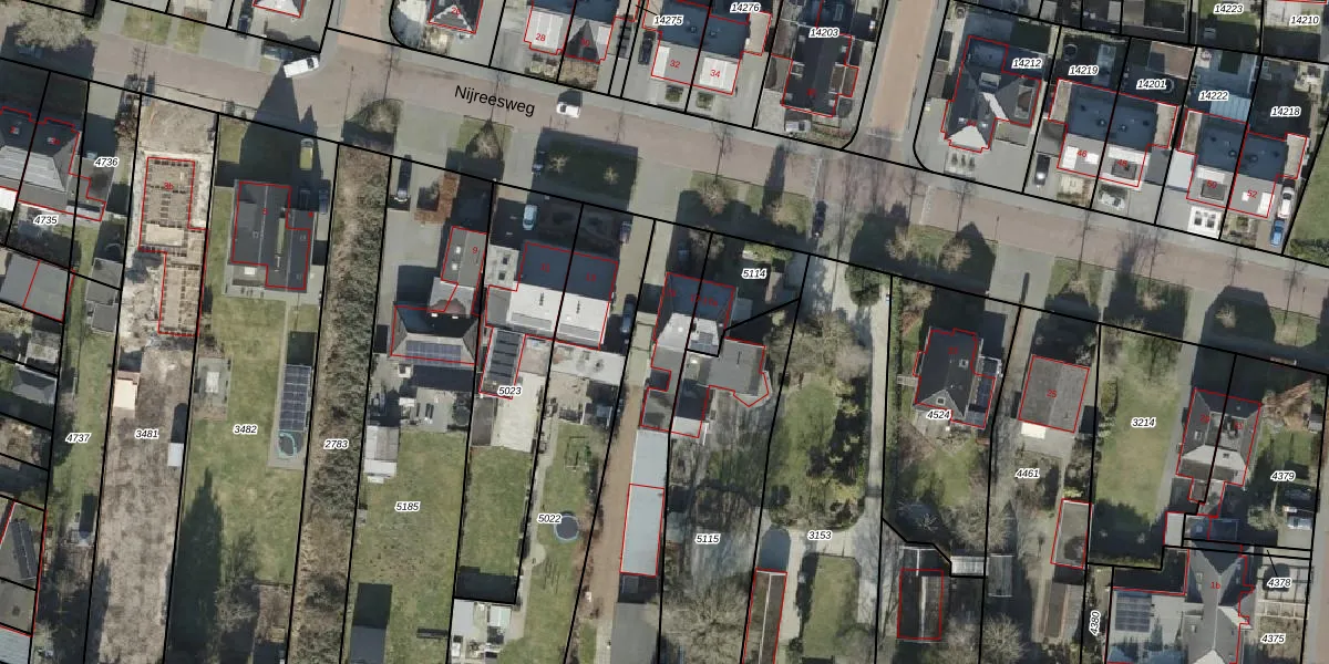 Het perceel waarop Nijreesweg 15 staat heeft een oppervlakte van 1015 m². Dit is een zeer groot perceel. De perceeloppervlakte wordt geregistreerd door het Kadaster. Gedetailleerde informatie over de maten van dit perceel kunt u vinden in het rapport Kadastrale kaart met maatvoering van Nijreesweg 15.