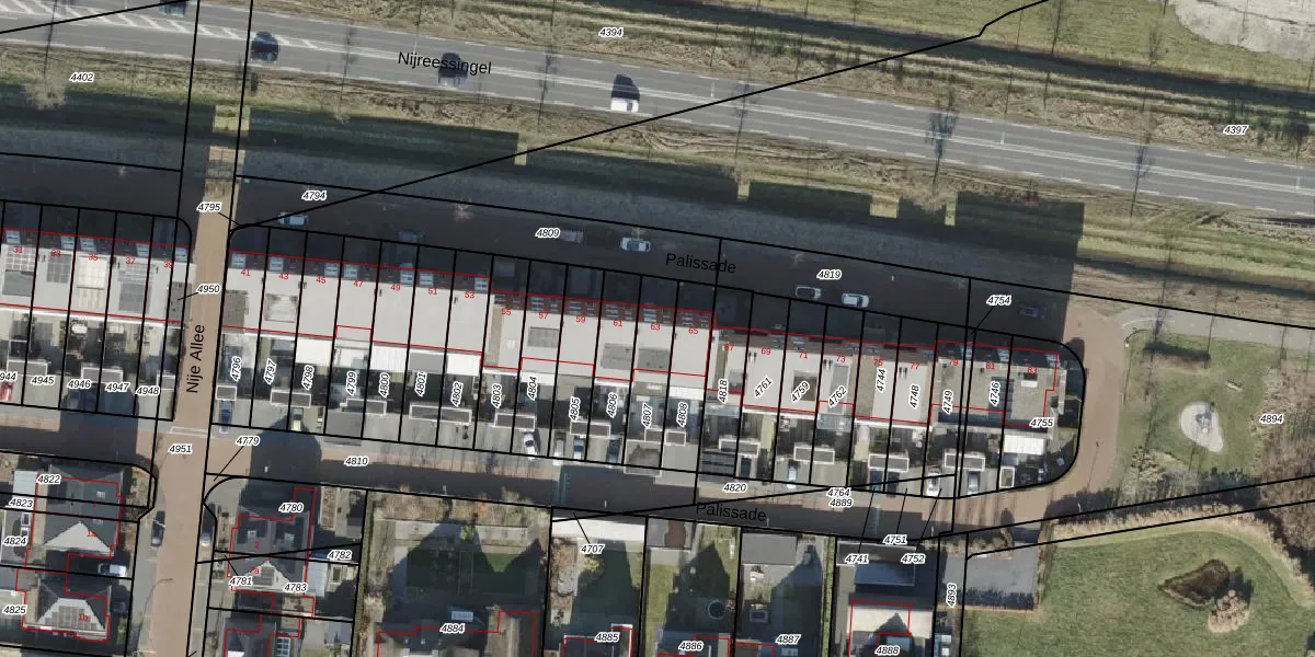 Het perceel waarop Palissade 63 staat heeft een oppervlakte van 165 m². Dit is een middelgroot perceel. De perceeloppervlakte wordt geregistreerd door het Kadaster. Gedetailleerde informatie over de maten van dit perceel kunt u vinden in het rapport Kadastrale kaart met maatvoering van Palissade 63.