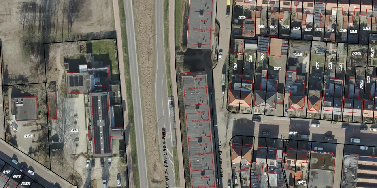 Het perceel waarop P.C. Boutensstraat 107 staat heeft een oppervlakte van 9667 m². Dit is een zeer groot perceel. De perceeloppervlakte wordt geregistreerd door het Kadaster. Gedetailleerde informatie over de maten van dit perceel kunt u vinden in het rapport Kadastrale kaart met maatvoering van P.C. Boutensstraat 107.