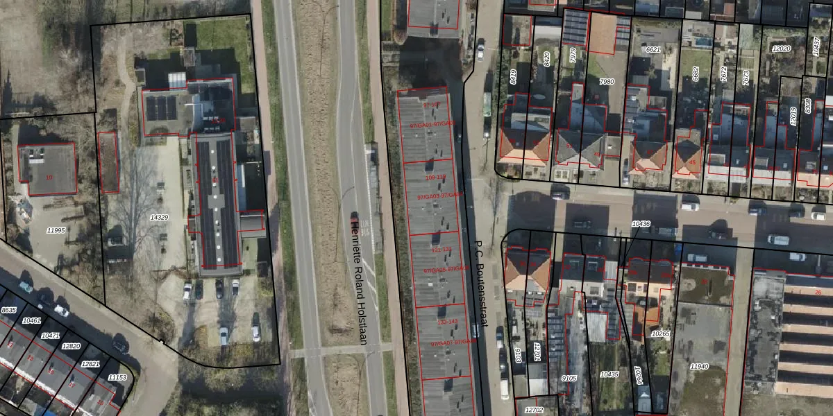 Het perceel waarop P.C. Boutensstraat 119 staat heeft een oppervlakte van 9667 m². Dit is een zeer groot perceel. De perceeloppervlakte wordt geregistreerd door het Kadaster. Gedetailleerde informatie over de maten van dit perceel kunt u vinden in het rapport Kadastrale kaart met maatvoering van P.C. Boutensstraat 119.