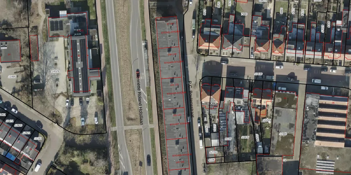 Het perceel waarop P.C. Boutensstraat 121 staat heeft een oppervlakte van 9667 m². Dit is een zeer groot perceel. De perceeloppervlakte wordt geregistreerd door het Kadaster. Gedetailleerde informatie over de maten van dit perceel kunt u vinden in het rapport Kadastrale kaart met maatvoering van P.C. Boutensstraat 121.