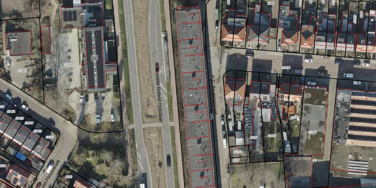 Het perceel waarop P.C. Boutensstraat 131 staat heeft een oppervlakte van 9667 m². Dit is een zeer groot perceel. De perceeloppervlakte wordt geregistreerd door het Kadaster. Gedetailleerde informatie over de maten van dit perceel kunt u vinden in het rapport Kadastrale kaart met maatvoering van P.C. Boutensstraat 131.