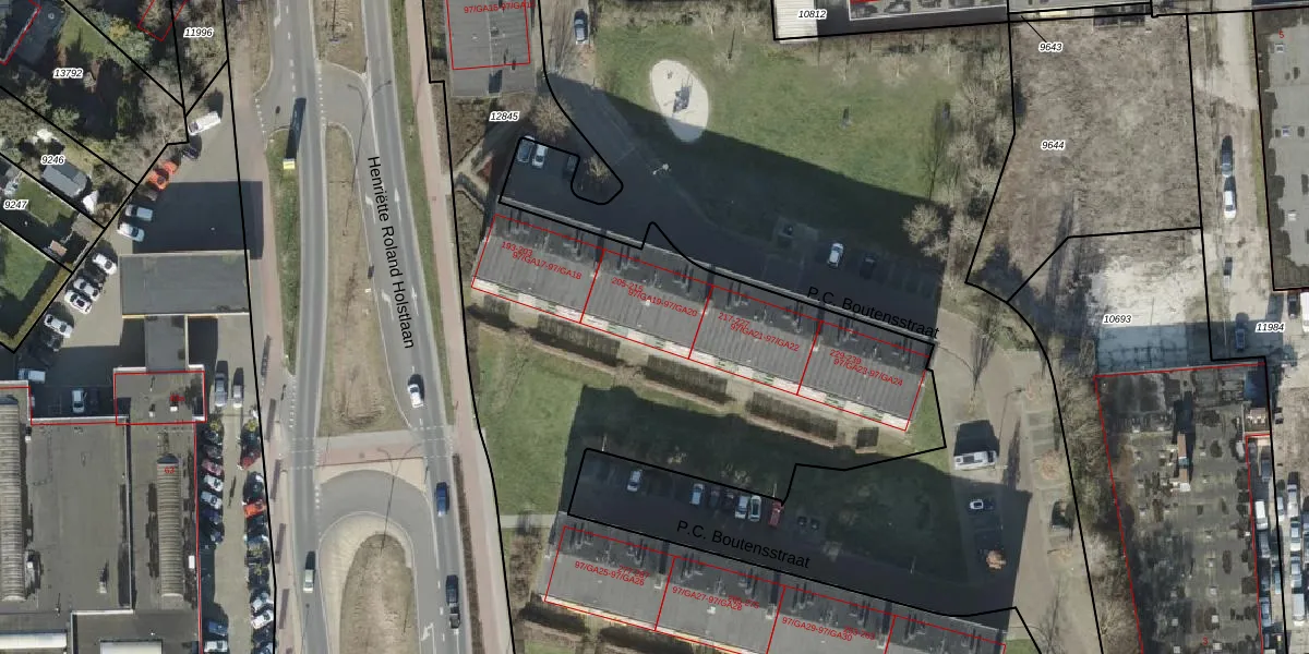 Het perceel waarop P.C. Boutensstraat 215 staat heeft een oppervlakte van 9667 m². Dit is een zeer groot perceel. De perceeloppervlakte wordt geregistreerd door het Kadaster. Gedetailleerde informatie over de maten van dit perceel kunt u vinden in het rapport Kadastrale kaart met maatvoering van P.C. Boutensstraat 215.