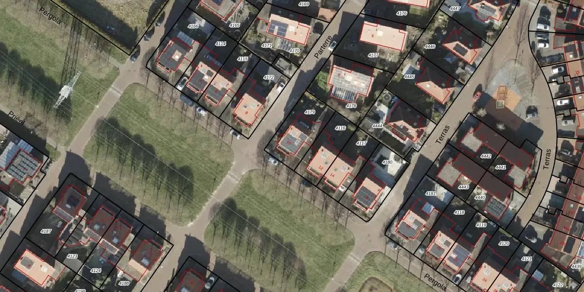Het perceel waarop Pergola 10 staat heeft een oppervlakte van 312 m². Dit is een groot perceel. De perceeloppervlakte wordt geregistreerd door het Kadaster. Gedetailleerde informatie over de maten van dit perceel kunt u vinden in het rapport Kadastrale kaart met maatvoering van Pergola 10.
