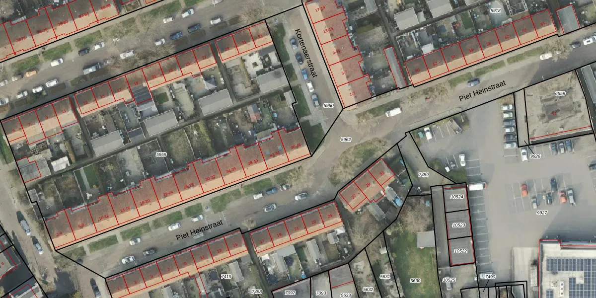 Het perceel waarop Piet Heinstraat 48 staat heeft een oppervlakte van 4500 m². Dit is een zeer groot perceel. De perceeloppervlakte wordt geregistreerd door het Kadaster. Gedetailleerde informatie over de maten van dit perceel kunt u vinden in het rapport Kadastrale kaart met maatvoering van Piet Heinstraat 48.