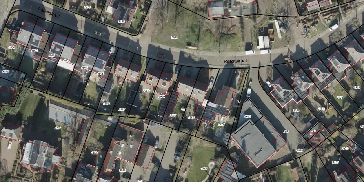 Het perceel waarop Reeststraat 9 staat heeft een oppervlakte van 357 m². Dit is een groot perceel. De perceeloppervlakte wordt geregistreerd door het Kadaster. Gedetailleerde informatie over de maten van dit perceel kunt u vinden in het rapport Kadastrale kaart met maatvoering van Reeststraat 9.