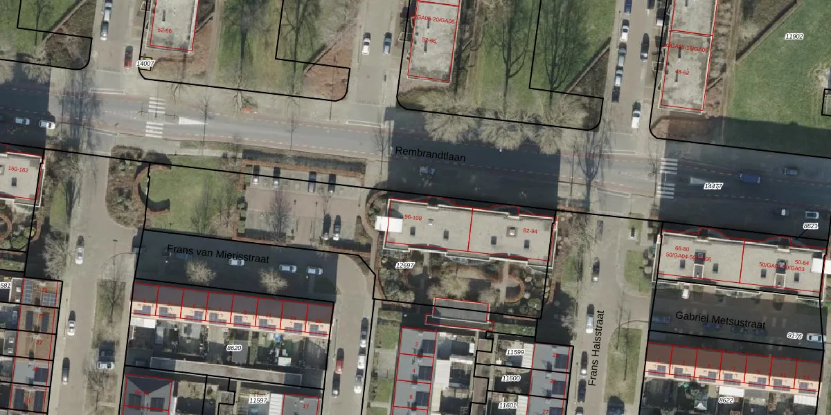Het perceel waarop Rembrandtlaan 102 staat heeft een oppervlakte van 2015 m². Dit is een zeer groot perceel. De perceeloppervlakte wordt geregistreerd door het Kadaster. Gedetailleerde informatie over de maten van dit perceel kunt u vinden in het rapport Kadastrale kaart met maatvoering van Rembrandtlaan 102.