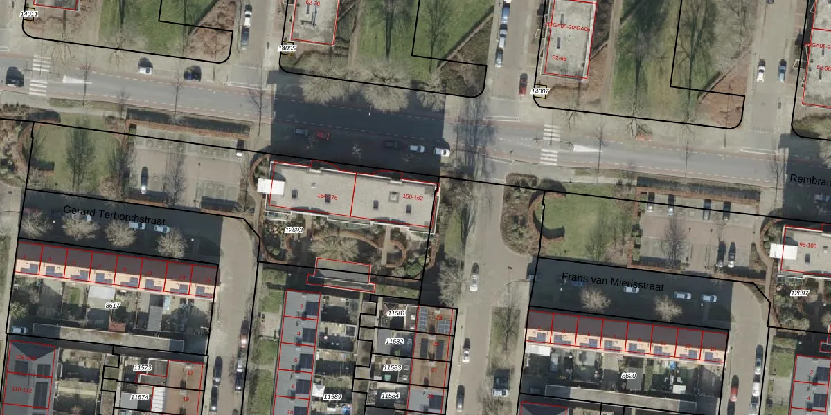Rembrandtlaan 154 is gelegen op kadastraal perceel AML01H12693. Deze kadastrale aanduiding is uniek en wordt gebruikt door het Kadaster om eigendomsrechten en andere zakelijke rechten vast te leggen. Het perceel maakt onderdeel uit van de kadastrale gemeente Ambt-Almelo.