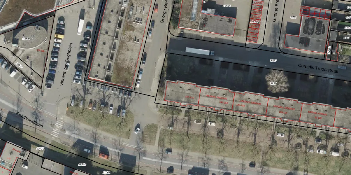 Het perceel waarop Rembrandtlaan 171 staat heeft een oppervlakte van 3760 m². Dit is een zeer groot perceel. De perceeloppervlakte wordt geregistreerd door het Kadaster. Gedetailleerde informatie over de maten van dit perceel kunt u vinden in het rapport Kadastrale kaart met maatvoering van Rembrandtlaan 171.