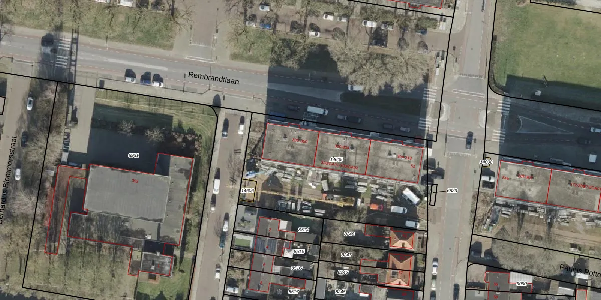 Het perceel waarop Rembrandtlaan 340 staat heeft een oppervlakte van 1855 m². Dit is een zeer groot perceel. De perceeloppervlakte wordt geregistreerd door het Kadaster. Gedetailleerde informatie over de maten van dit perceel kunt u vinden in het rapport Kadastrale kaart met maatvoering van Rembrandtlaan 340.