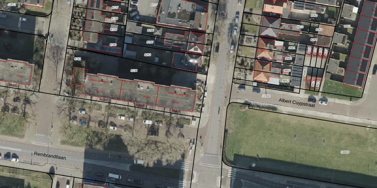 Het perceel waarop Rembrandtlaan 35 staat heeft een oppervlakte van 1845 m². Dit is een zeer groot perceel. De perceeloppervlakte wordt geregistreerd door het Kadaster. Gedetailleerde informatie over de maten van dit perceel kunt u vinden in het rapport Kadastrale kaart met maatvoering van Rembrandtlaan 35.