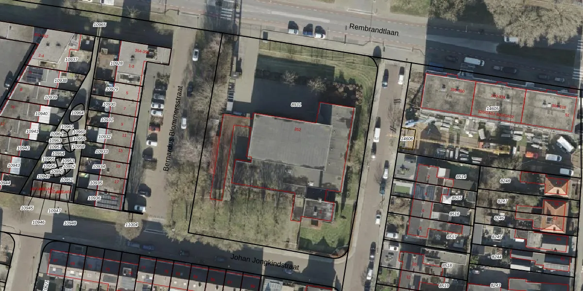 Het perceel waarop Rembrandtlaan 352 staat heeft een oppervlakte van 3850 m². Dit is een zeer groot perceel. De perceeloppervlakte wordt geregistreerd door het Kadaster. Gedetailleerde informatie over de maten van dit perceel kunt u vinden in het rapport Kadastrale kaart met maatvoering van Rembrandtlaan 352.