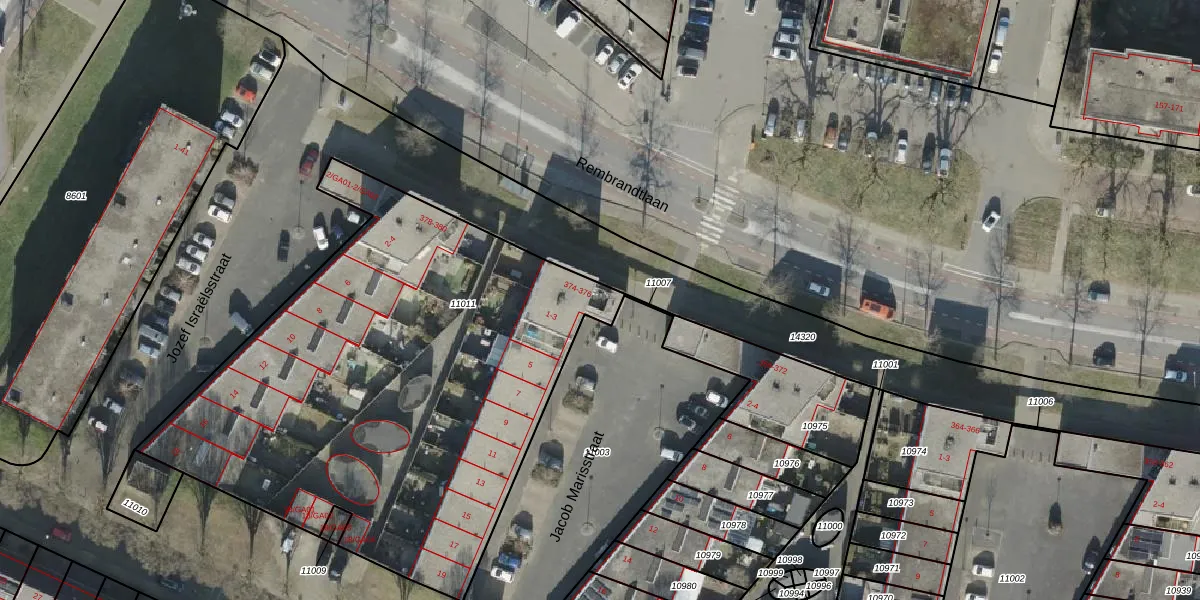 Rembrandtlaan 374 is gelegen op kadastraal perceel AML01H11011. Deze kadastrale aanduiding is uniek en wordt gebruikt door het Kadaster om eigendomsrechten en andere zakelijke rechten vast te leggen. Het perceel maakt onderdeel uit van de kadastrale gemeente Ambt-Almelo.