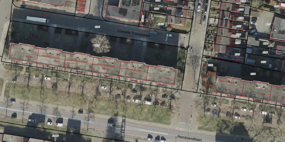 Het perceel waarop Rembrandtlaan 97 staat heeft een oppervlakte van 3760 m². Dit is een zeer groot perceel. De perceeloppervlakte wordt geregistreerd door het Kadaster. Gedetailleerde informatie over de maten van dit perceel kunt u vinden in het rapport Kadastrale kaart met maatvoering van Rembrandtlaan 97.