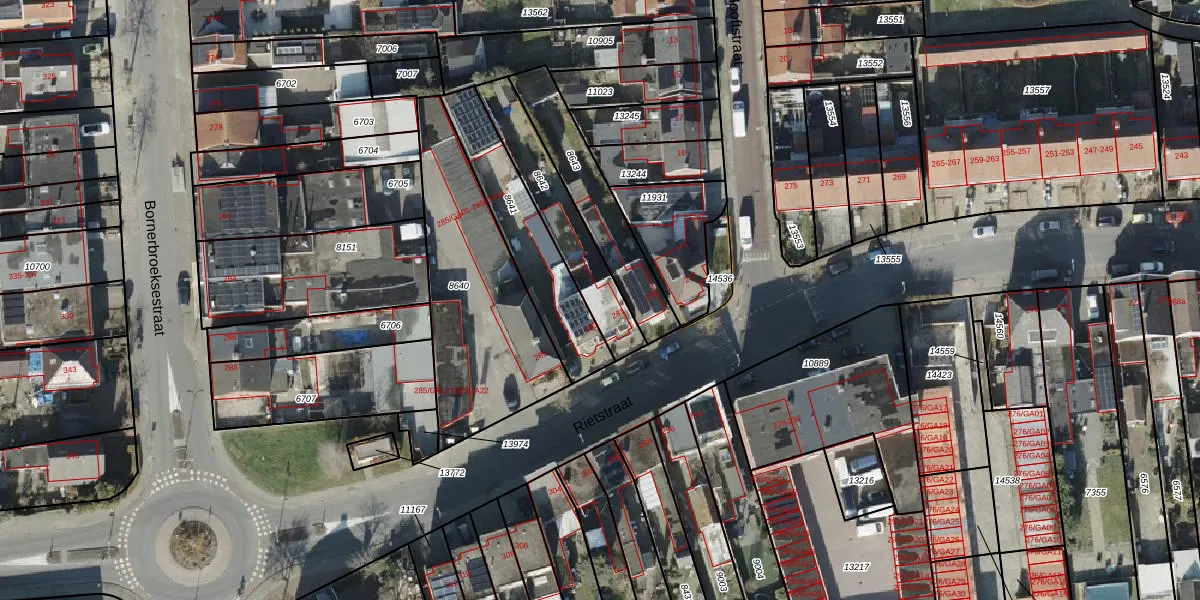 Rietstraat 281 is gelegen op kadastraal perceel AML01H8642. Deze kadastrale aanduiding is uniek en wordt gebruikt door het Kadaster om eigendomsrechten en andere zakelijke rechten vast te leggen. Het perceel maakt onderdeel uit van de kadastrale gemeente Ambt-Almelo.