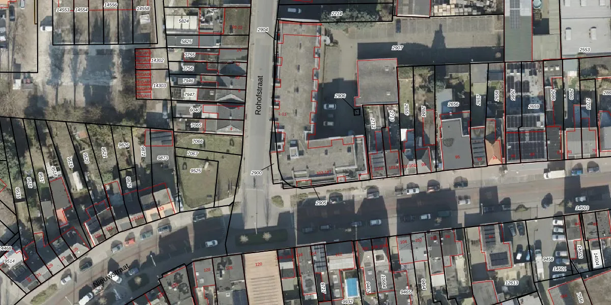 Het perceel waarop Rohofstraat 3-15 staat heeft een oppervlakte van 2412 m². Dit is een zeer groot perceel. De perceeloppervlakte wordt geregistreerd door het Kadaster. Gedetailleerde informatie over de maten van dit perceel kunt u vinden in het rapport Kadastrale kaart met maatvoering van Rohofstraat 3-15.