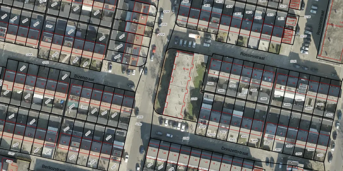 Rossinistraat 34 is gelegen op kadastraal perceel AML01I2243. Deze kadastrale aanduiding is uniek en wordt gebruikt door het Kadaster om eigendomsrechten en andere zakelijke rechten vast te leggen. Het perceel maakt onderdeel uit van de kadastrale gemeente Ambt-Almelo.