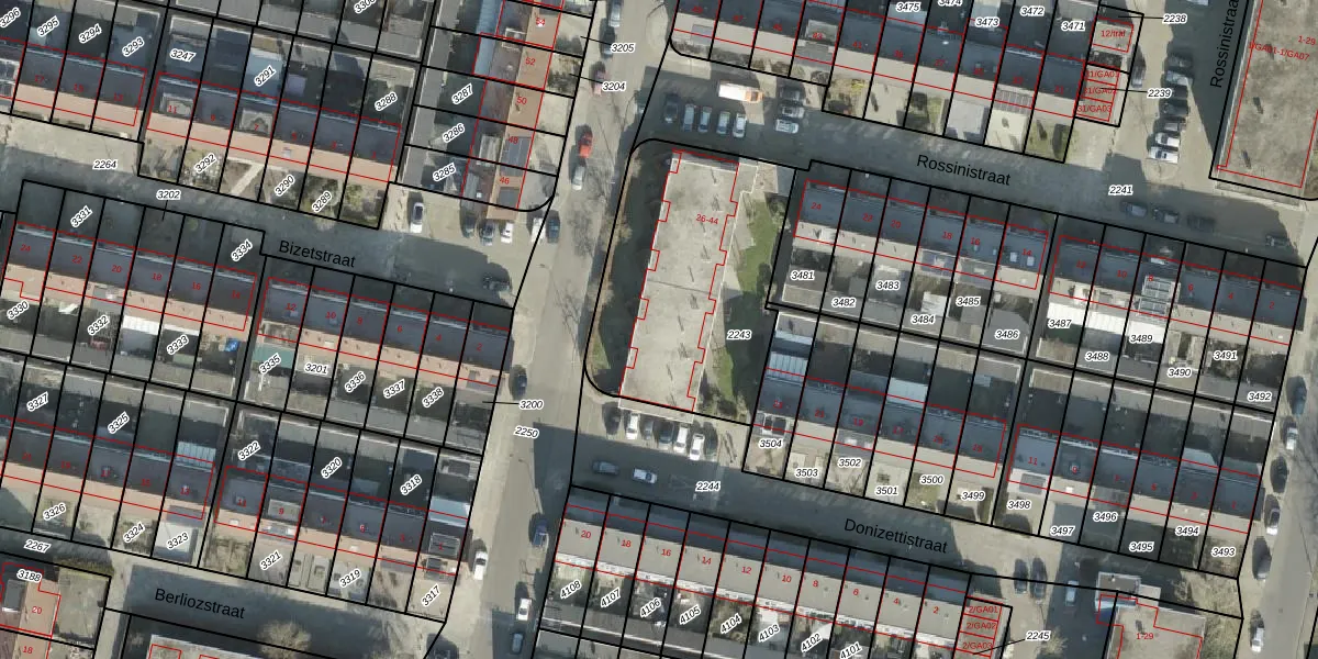 Rossinistraat 38 is gelegen op kadastraal perceel AML01I2243. Deze kadastrale aanduiding is uniek en wordt gebruikt door het Kadaster om eigendomsrechten en andere zakelijke rechten vast te leggen. Het perceel maakt onderdeel uit van de kadastrale gemeente Ambt-Almelo.