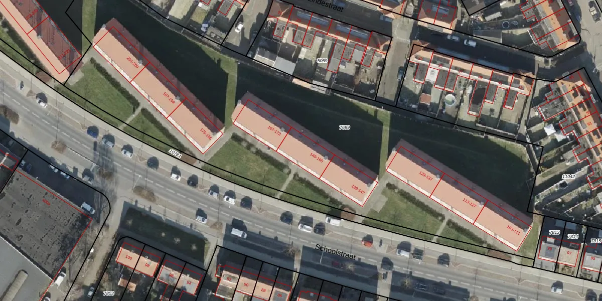 Schoolstraat 161 is gelegen op kadastraal perceel AML01H7699. Deze kadastrale aanduiding is uniek en wordt gebruikt door het Kadaster om eigendomsrechten en andere zakelijke rechten vast te leggen. Het perceel maakt onderdeel uit van de kadastrale gemeente Ambt-Almelo.