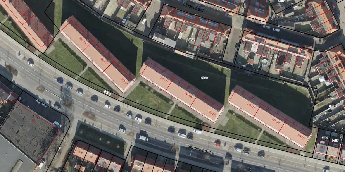 Schoolstraat 165 is gelegen op kadastraal perceel AML01H7699. Deze kadastrale aanduiding is uniek en wordt gebruikt door het Kadaster om eigendomsrechten en andere zakelijke rechten vast te leggen. Het perceel maakt onderdeel uit van de kadastrale gemeente Ambt-Almelo.