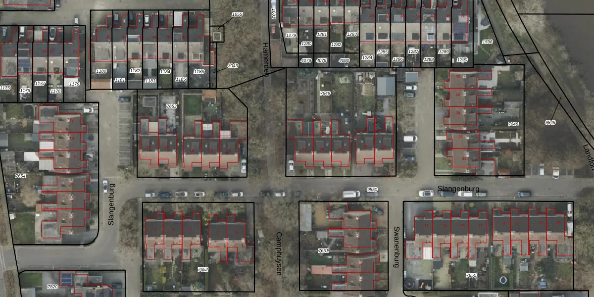 Het perceel waarop Slangenburg 24 staat heeft een oppervlakte van 1353 m². Dit is een zeer groot perceel. De perceeloppervlakte wordt geregistreerd door het Kadaster. Gedetailleerde informatie over de maten van dit perceel kunt u vinden in het rapport Kadastrale kaart met maatvoering van Slangenburg 24.