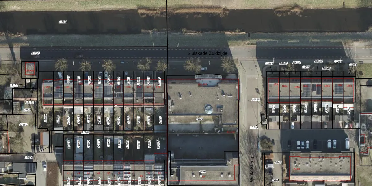 Sluiskade Zuidzijde 181 is gelegen op kadastraal perceel AML01B8879. Deze kadastrale aanduiding is uniek en wordt gebruikt door het Kadaster om eigendomsrechten en andere zakelijke rechten vast te leggen. Het perceel maakt onderdeel uit van de kadastrale gemeente Ambt-Almelo.