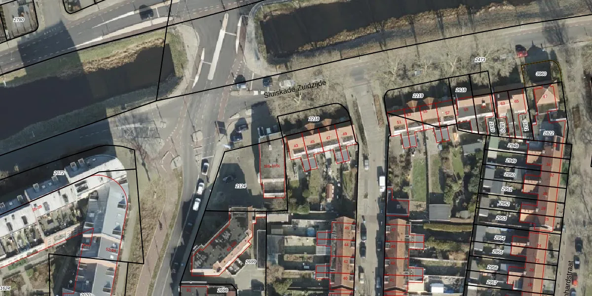 Het perceel waarop Sluiskade Zuidzijde 43 staat heeft een oppervlakte van 4079 m². Dit is een zeer groot perceel. De perceeloppervlakte wordt geregistreerd door het Kadaster. Gedetailleerde informatie over de maten van dit perceel kunt u vinden in het rapport Kadastrale kaart met maatvoering van Sluiskade Zuidzijde 43.