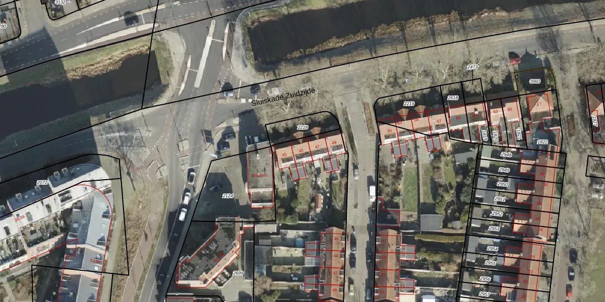 Het perceel waarop Sluiskade Zuidzijde 45 staat heeft een oppervlakte van 4079 m². Dit is een zeer groot perceel. De perceeloppervlakte wordt geregistreerd door het Kadaster. Gedetailleerde informatie over de maten van dit perceel kunt u vinden in het rapport Kadastrale kaart met maatvoering van Sluiskade Zuidzijde 45.