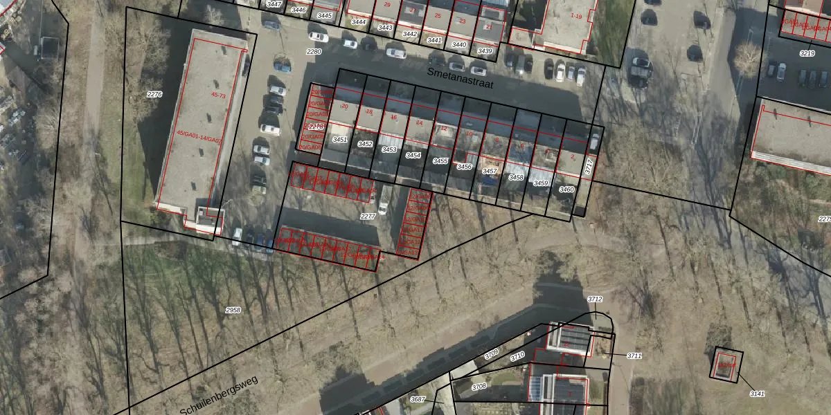 Smetanastraat 12-GA09 is gelegen op kadastraal perceel AML01I2277. Deze kadastrale aanduiding is uniek en wordt gebruikt door het Kadaster om eigendomsrechten en andere zakelijke rechten vast te leggen. Het perceel maakt onderdeel uit van de kadastrale gemeente Ambt-Almelo.