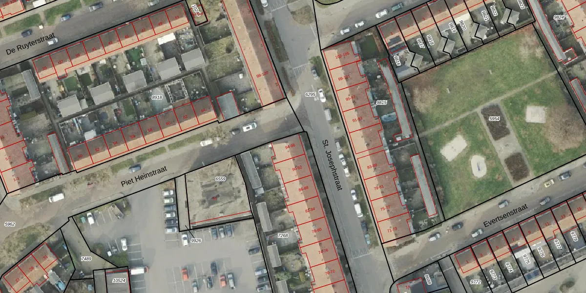 Het perceel waarop St. Josephstraat 96 staat heeft een oppervlakte van 1555 m². Dit is een zeer groot perceel. De perceeloppervlakte wordt geregistreerd door het Kadaster. Gedetailleerde informatie over de maten van dit perceel kunt u vinden in het rapport Kadastrale kaart met maatvoering van St. Josephstraat 96.