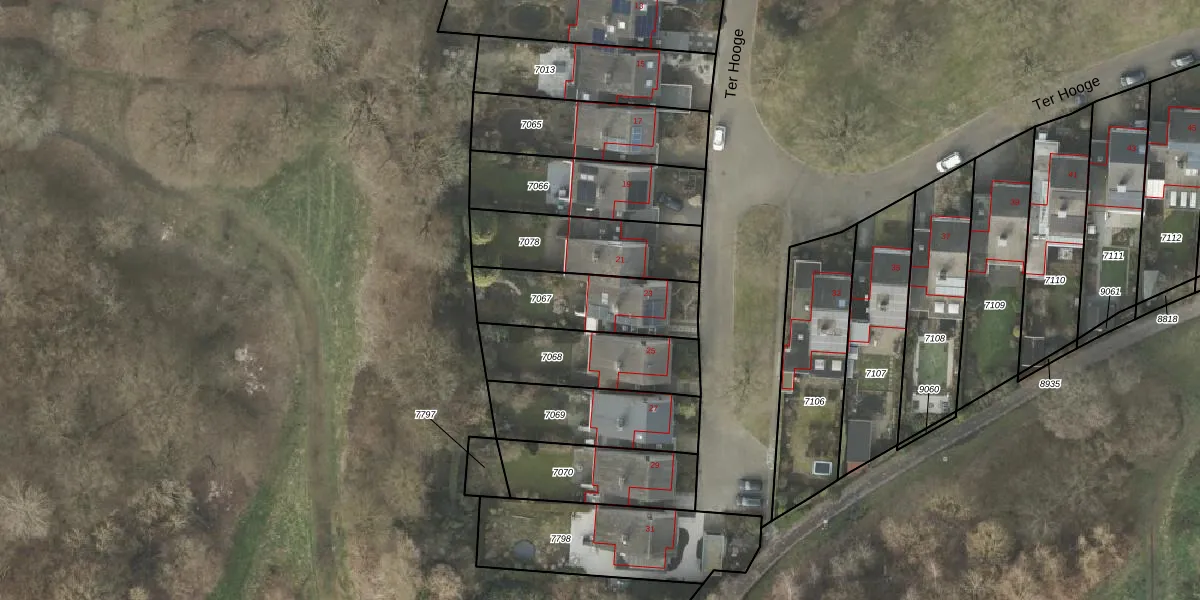 Het perceel waarop Ter Hooge 23 staat heeft een oppervlakte van 352 m². Dit is een groot perceel. De perceeloppervlakte wordt geregistreerd door het Kadaster. Gedetailleerde informatie over de maten van dit perceel kunt u vinden in het rapport Kadastrale kaart met maatvoering van Ter Hooge 23.