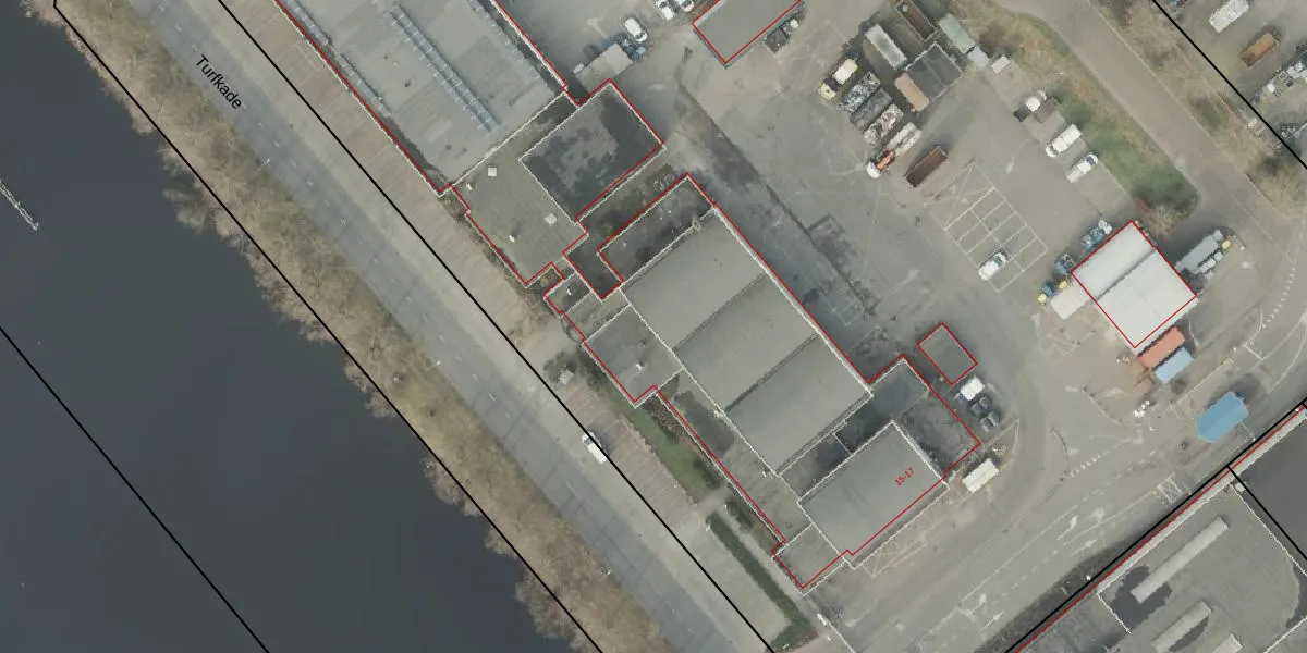 Het perceel waarop Turfkade 15 staat heeft een oppervlakte van 1,7 ha. Dit is een zeer groot perceel. De perceeloppervlakte wordt geregistreerd door het Kadaster. Gedetailleerde informatie over de maten van dit perceel kunt u vinden in het rapport Kadastrale kaart met maatvoering van Turfkade 15.