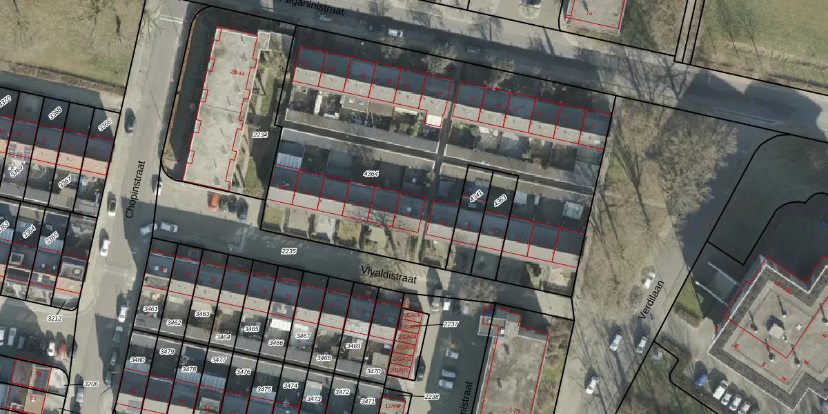 Het perceel waarop Vivaldistraat 13 staat heeft een oppervlakte van 3596 m². Dit is een zeer groot perceel. De perceeloppervlakte wordt geregistreerd door het Kadaster. Gedetailleerde informatie over de maten van dit perceel kunt u vinden in het rapport Kadastrale kaart met maatvoering van Vivaldistraat 13.