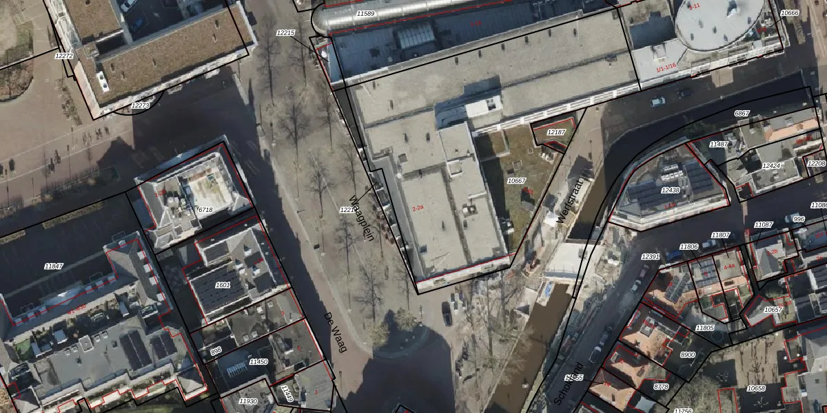 Het perceel waarop Waagplein 2 staat heeft een oppervlakte van 2555 m². Dit is een zeer groot perceel. De perceeloppervlakte wordt geregistreerd door het Kadaster. Gedetailleerde informatie over de maten van dit perceel kunt u vinden in het rapport Kadastrale kaart met maatvoering van Waagplein 2.