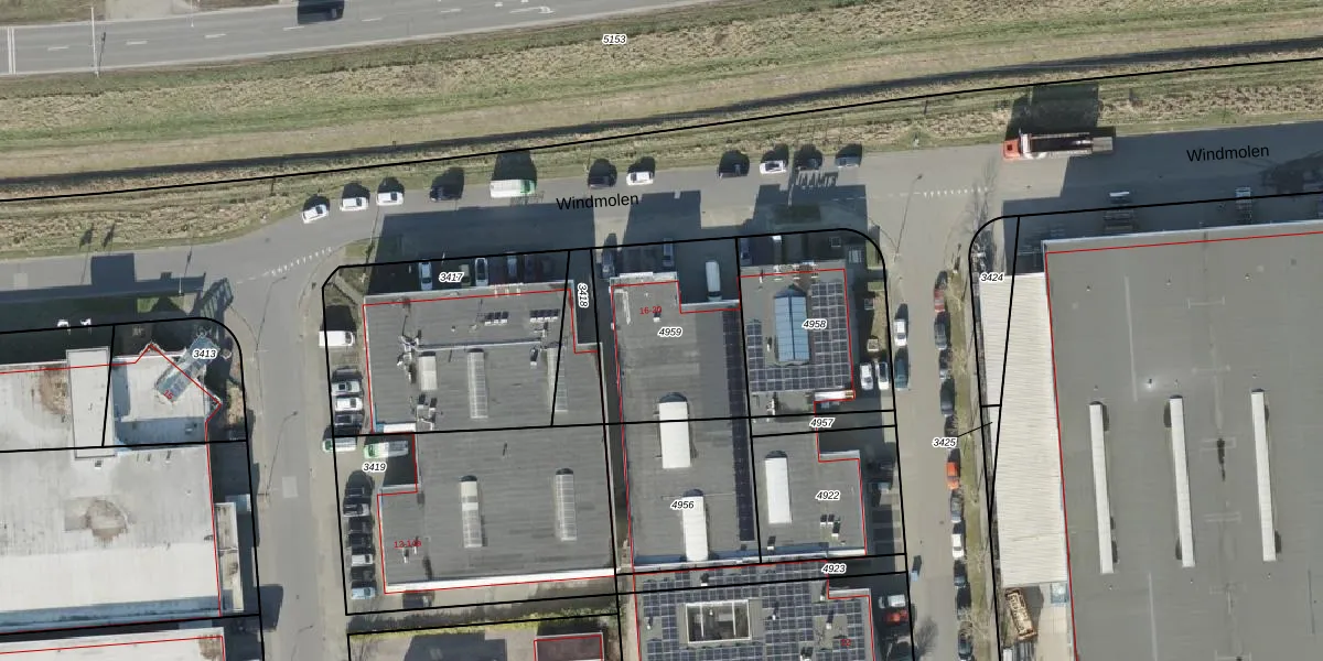 Het perceel waarop Windmolen 16 staat heeft een oppervlakte van 594 m². Dit is een groot perceel. De perceeloppervlakte wordt geregistreerd door het Kadaster. Gedetailleerde informatie over de maten van dit perceel kunt u vinden in het rapport Kadastrale kaart met maatvoering van Windmolen 16.