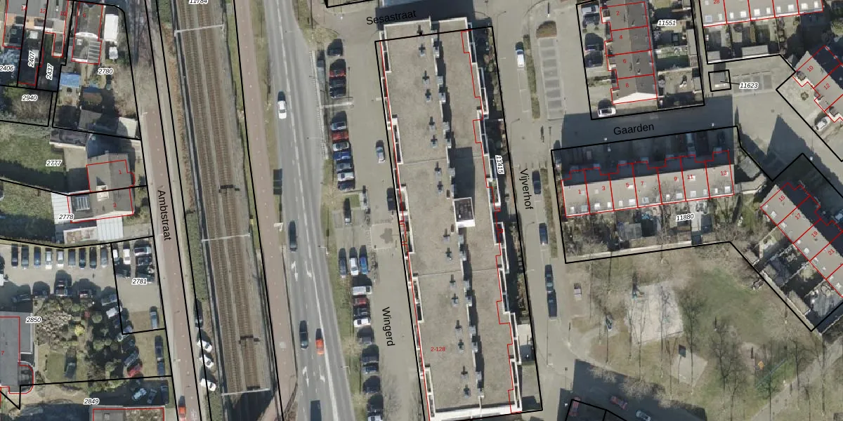 Het perceel waarop Wingerd 32 staat heeft een oppervlakte van 2574 m². Dit is een zeer groot perceel. De perceeloppervlakte wordt geregistreerd door het Kadaster. Gedetailleerde informatie over de maten van dit perceel kunt u vinden in het rapport Kadastrale kaart met maatvoering van Wingerd 32.
