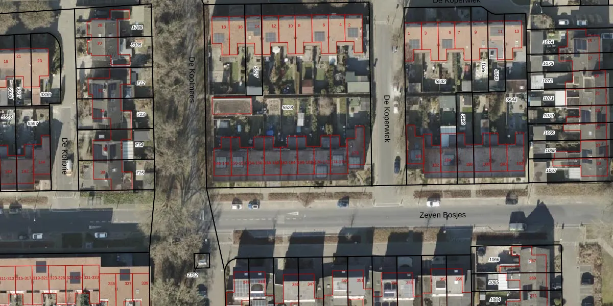 Het perceel waarop Zeven Bosjes 168 staat heeft een oppervlakte van 3073 m². Dit is een zeer groot perceel. De perceeloppervlakte wordt geregistreerd door het Kadaster. Gedetailleerde informatie over de maten van dit perceel kunt u vinden in het rapport Kadastrale kaart met maatvoering van Zeven Bosjes 168.