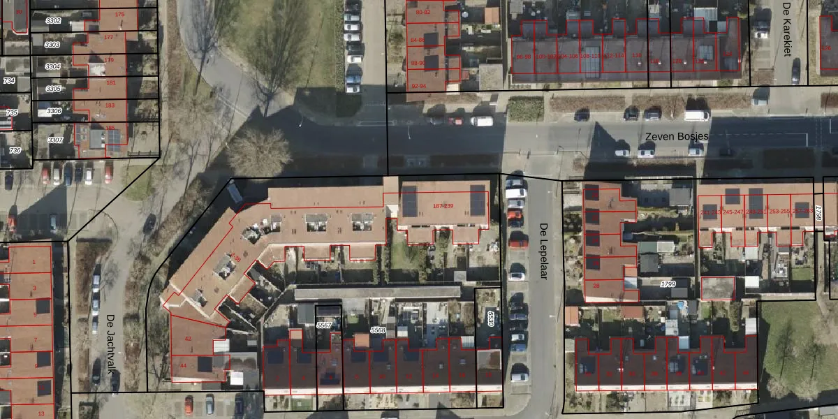 Het perceel waarop Zeven Bosjes 217 staat heeft een oppervlakte van 3995 m². Dit is een zeer groot perceel. De perceeloppervlakte wordt geregistreerd door het Kadaster. Gedetailleerde informatie over de maten van dit perceel kunt u vinden in het rapport Kadastrale kaart met maatvoering van Zeven Bosjes 217.