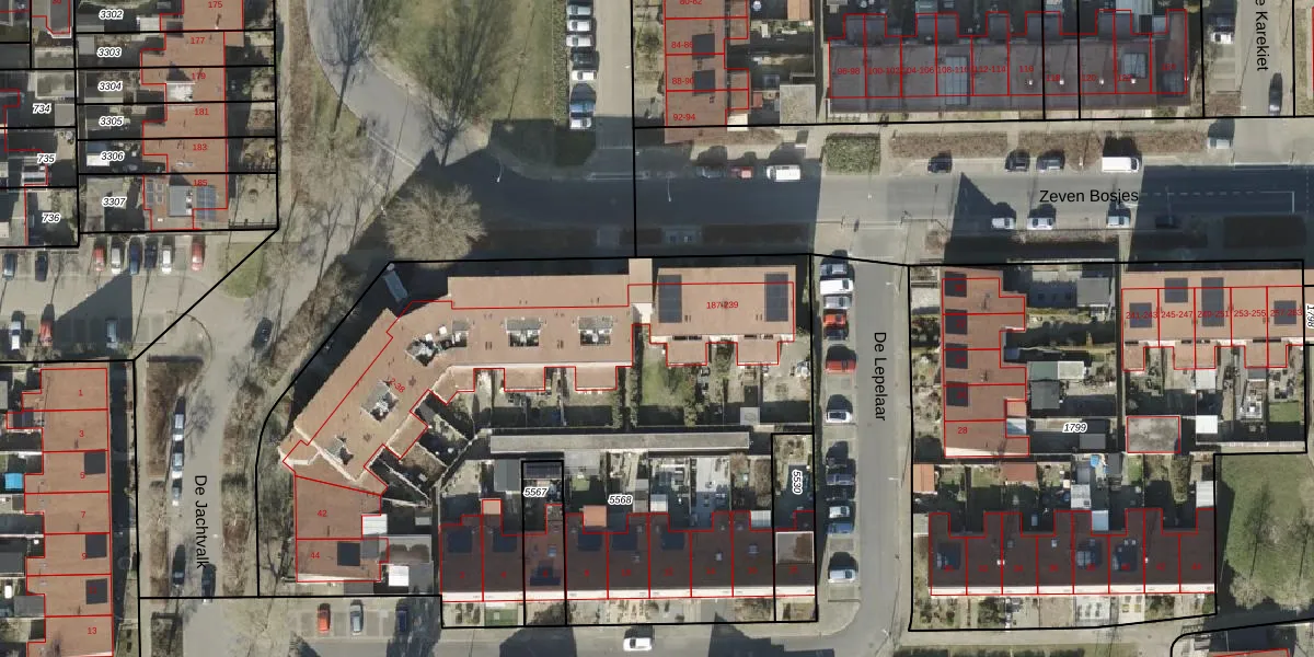 Het perceel waarop Zeven Bosjes 239 staat heeft een oppervlakte van 3995 m². Dit is een zeer groot perceel. De perceeloppervlakte wordt geregistreerd door het Kadaster. Gedetailleerde informatie over de maten van dit perceel kunt u vinden in het rapport Kadastrale kaart met maatvoering van Zeven Bosjes 239.