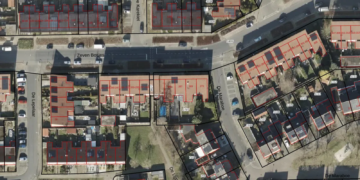Het perceel waarop Zeven Bosjes 267 staat heeft een oppervlakte van 950 m². Dit is een groot perceel. De perceeloppervlakte wordt geregistreerd door het Kadaster. Gedetailleerde informatie over de maten van dit perceel kunt u vinden in het rapport Kadastrale kaart met maatvoering van Zeven Bosjes 267.