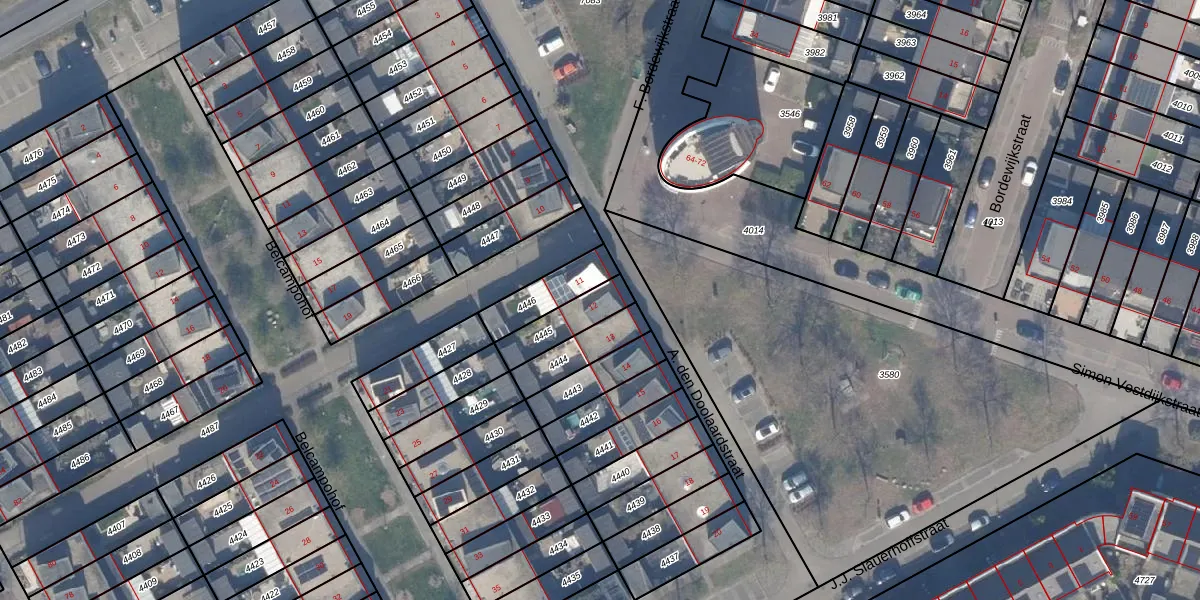 Het adres is gelegen op perceel 4445 in de sectie Q en de kadastrale gemeente Almere. De kadastrale aanduiding is aldus AMR04-Q-4445. Het perceel is kleiner dan gemiddeld in Almere. Het perceel is 130 m² groot, terwijl het gemiddelde ligt op 3328,15 m². De grootste perceeloppervlakte in de kadastrale gemeente is 32,12 km². De kleinste oppervlakte bedraagt 0 m². Op het perceel bevinden zich geen andere adressen. De laatste wijziging in het de Basisregistratie Kadaster (BRK) was op 27-07-2006.