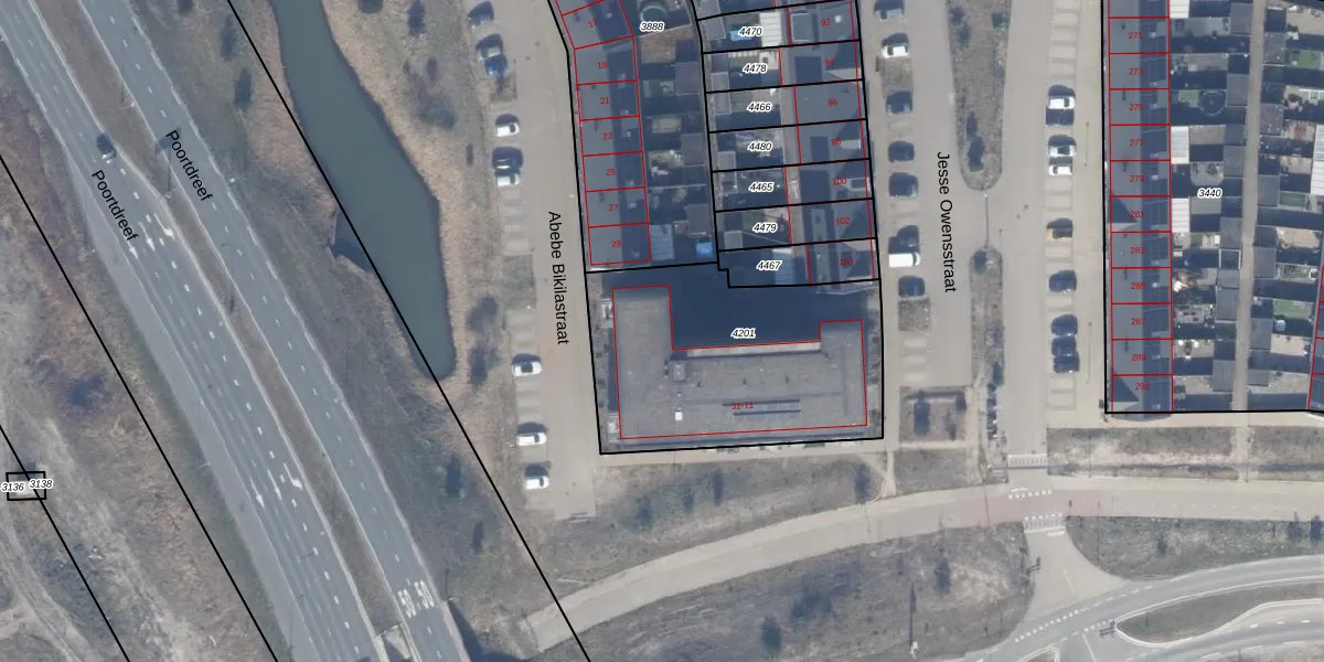 Abebe Bikilastraat 33 is gelegen op kadastraal perceel AMR04W4201. Deze kadastrale aanduiding is uniek en wordt gebruikt door het Kadaster om eigendomsrechten en andere zakelijke rechten vast te leggen. Het perceel maakt onderdeel uit van de kadastrale gemeente Almere.